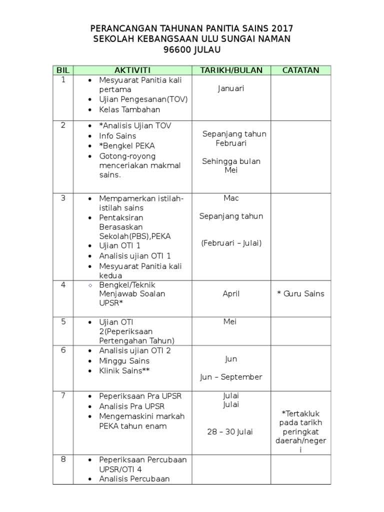 SEKOLAH KEBANGSAAN TAKWIM PANITIA MATA PELAJARAN SEJARAH 2016 Bulan Bil Jenis Aktiviti Jan Feb Mac Apr Mei Jun Jul Ogos Sept Okt Nov Dis 1 Mesyuarat Panitia X X X X 2 Taklimat Pentaksiran X X 3 Teknik mengajar sejarah berkesan X X X Program cemerlang sejarah 4 Program pemantapan kemahiran menguasai X X X X matapelajaran sejarah 5 Peperiksaan pertengahan tahun X 6 Program. RANCANGAN AKTIVITI KELAB SEJARAH Minggu Program Aktiviti Objektif Catatan Nilai 1 Mesyuarat Agong 1. Harap dapat dimanfaatkan dengan sebaiknya.