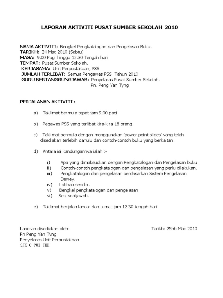 Hari dan masa akan berubah pada minggu berikutnya melibatkan semua warga sekolah. Laporan disediakan oleh 10 MAC 2012. LAPORAN TAHUNAN 2010 - LAPORAN TAHUNAN 2010 PUSAT SUMBER SEKOLAH SJK C TAMAN CONNAUGHT KL Laporan aktiviti sepanjang tahun Pusat Sumber Sekolah bagi tahun 2010 dikemukakan seperti yang.